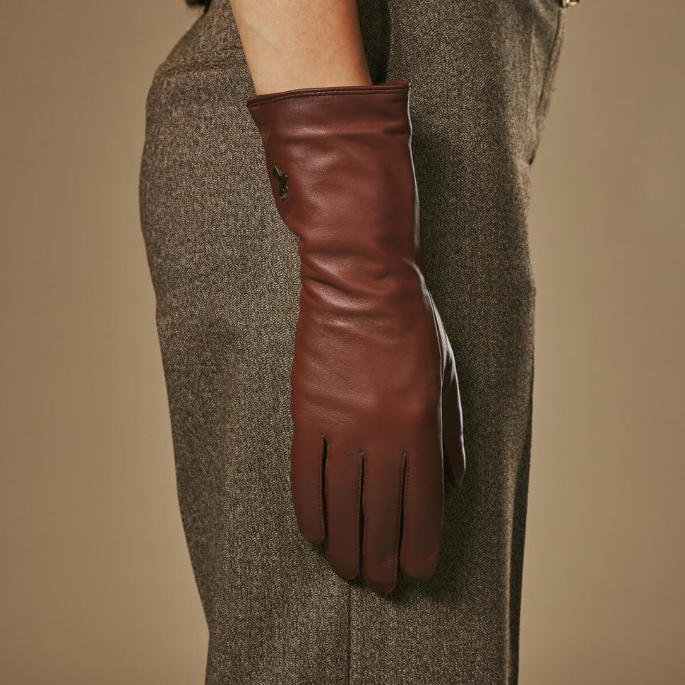 Emma (brown) - Extra-long sheepskin leather gloves with luxurious cashmere lining & touchscreen feature