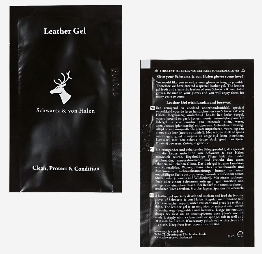 One major advantage our leather and suede gloves have over wool or other cloth gloves is that leather gloves from Schwartz & von Halen are completely wind and waterproof. To make your leather gloves even more resistant to rainy and cold weather, we recommend treating them with our leather gel – unfortunately it's not suitable for suede gloves. Leather gel is included with every pair of gloves, free of charge.